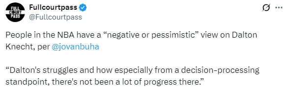 继续透露道:在和独行侠的季前赛上,我和一位球探进行了交谈,他是另一支球队的球探,他谈到了道尔顿(克内克特)的挣扎。尤其是在比赛决策上,他在这方面没有取得太大的进步,这也是他在攻防两端都无法找到正确方法去帮助球队的原因。